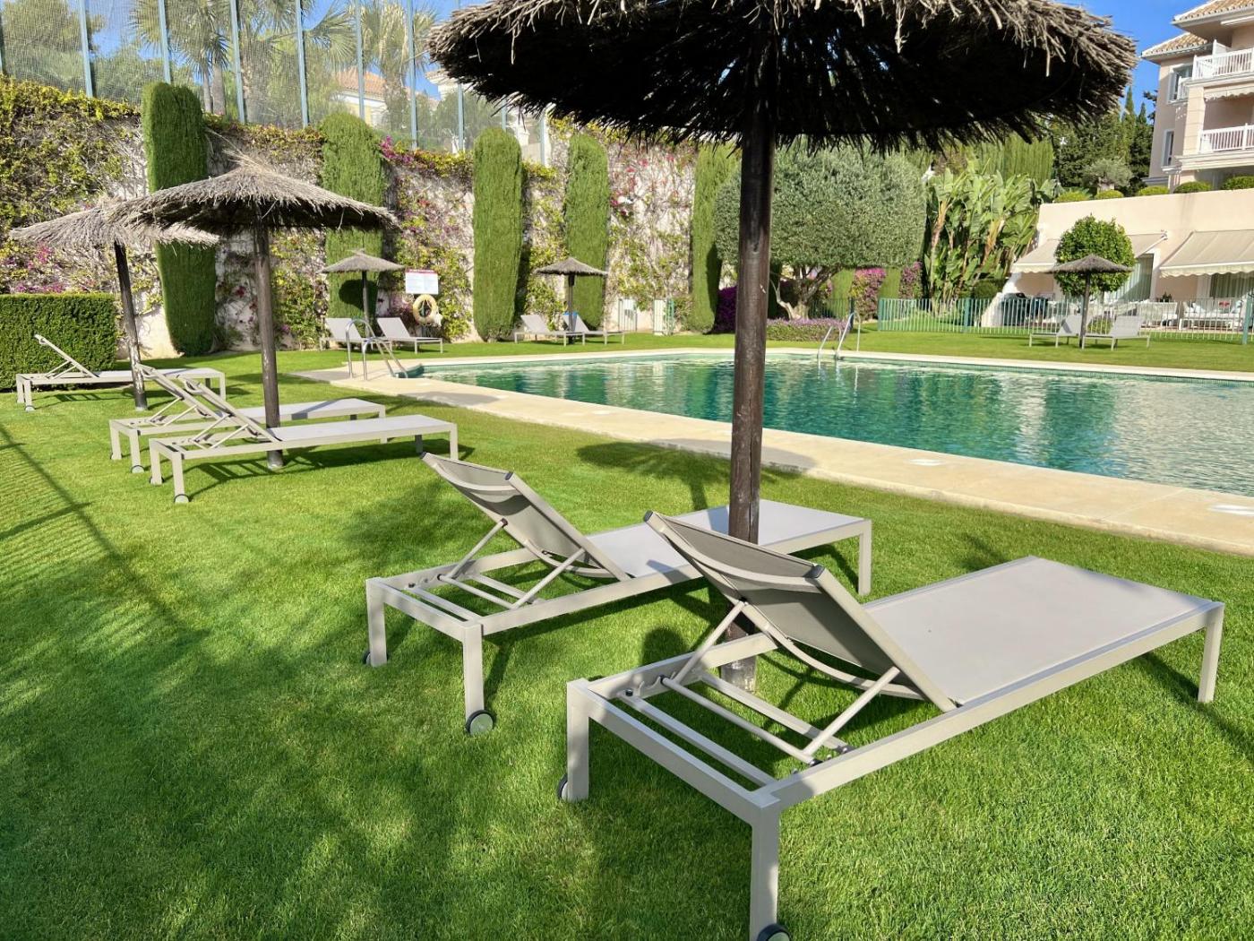 35 - Grand appartement a El Lago, Los flamingo, que tiene piscina al aire libre y vistas a la montaña, se encuentra en Estepona. El alojamiento, que está a 2,9 km de Playa del Saladillo, dispone de terraza y parking privado gratis.